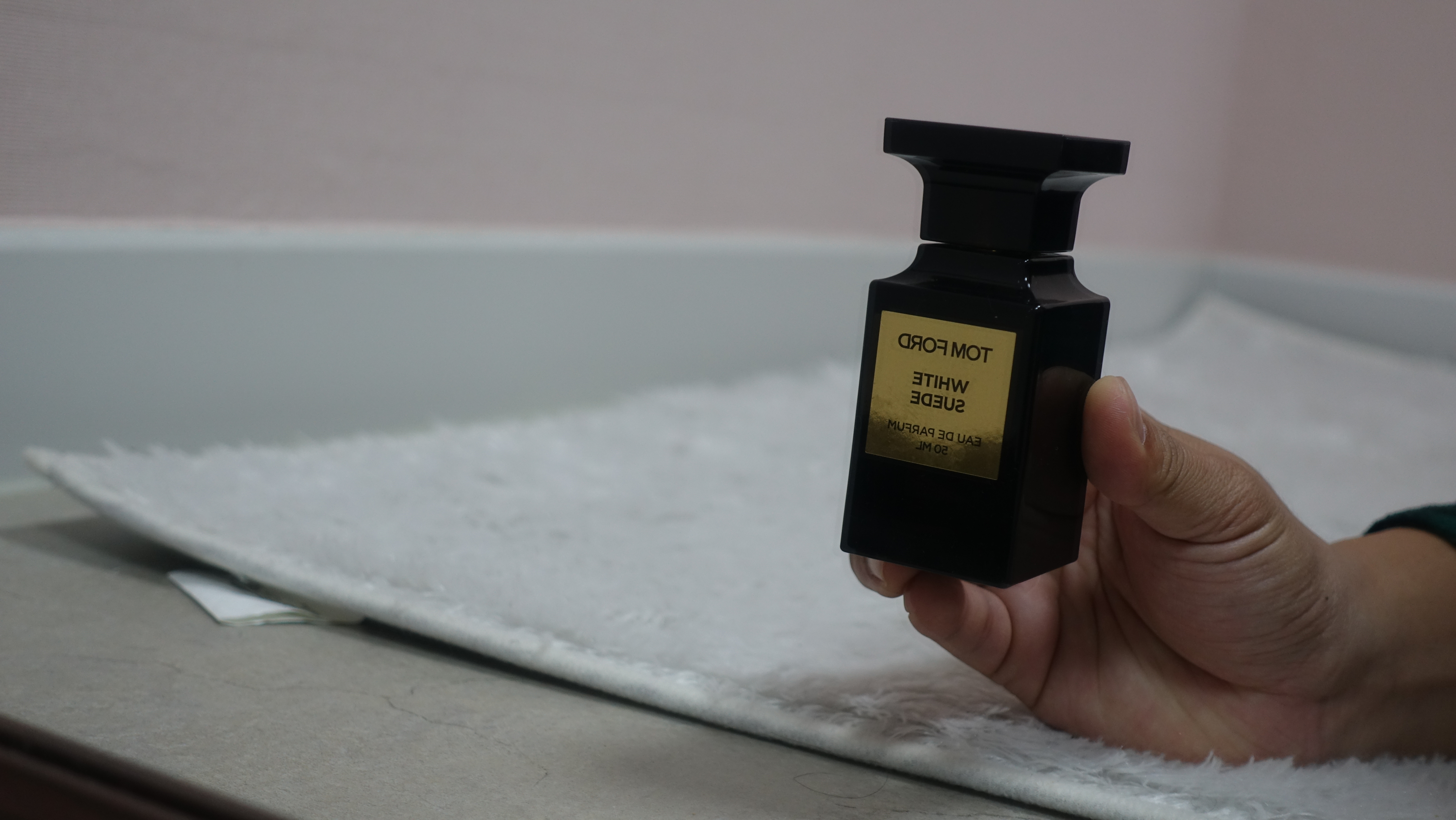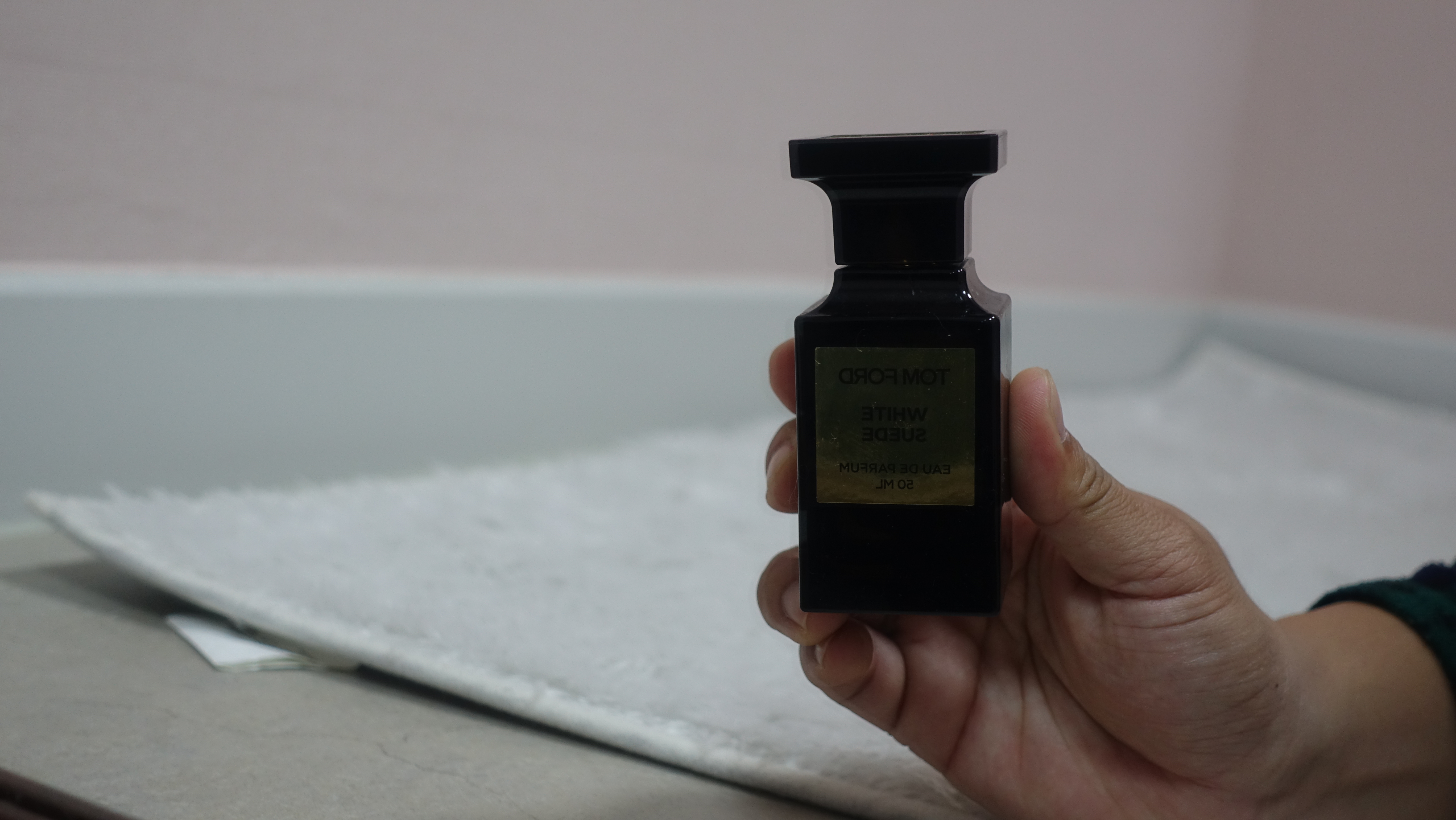 이렇게 거울에 비쳐진 화이트 스웨이드 톰포드의 모습을 확인할수도 있었습니다. 손을 좀 더 이쁘게 찍었으면 좋았겠지만 그 부분은 저도 아쉽긴 하네요. 50ML라서 구매하기에도 참 좋은 향수입니다.