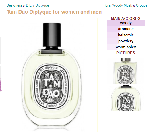 이렇게 딥디크 탐다오의 향수를 전문 조향 사이트에서 살펴보면 확인할수 있었어요. 우디 향수와 함께 아로마틱, 발사믹, 파우더리의 향이 전체적으로 깔려있습니다. 이 향에서의 탑노트와 미들, 베이스를 확인할수도 있었어요.